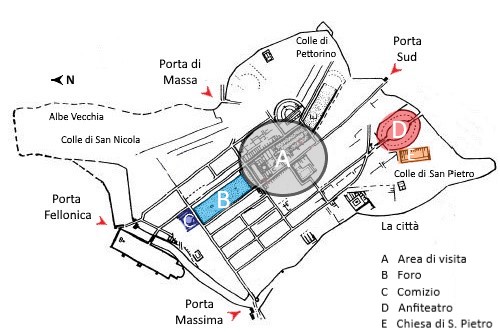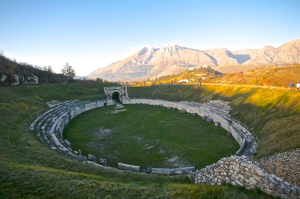 Al di fuori dell’area centrale, raggiungibile da un sentiero che si distacca dalla strada che conduce al colle di San Pietro, sorge l’Anfiteatro (D). Di forma ovale e con dimensioni di 96 x 79 metri, fu costruito nella prima metà del I sec. d.C. grazie al testamento di Quinto Nevio Sutorio Macrone, ricordato nell’iscrizione sull’arco di ingresso. Nella parte inferiore della cavea restano gli ingressi per i gladiatori e le bestie.