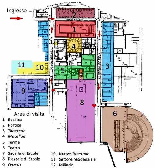 Il Portico (2) antistante la basilica è stato identificato come diribitorium, ossia il luogo in cui si espletavano le operazioni di voto. Il perimetro è disegnato dalle basi di colonna a ridosso di Via dell’Elefante e dalle lastre pavimentali che coprono l’area. Più a Nord si riconosce la superficie allungata della piazza del Foro (B), centro nevralgico della vita amministrativa e politica della città. In fondo al foro, le indagini hanno messo in luce il Comizio (C), luogo di incontro per le adunanze cittadine, oggi non visibile.