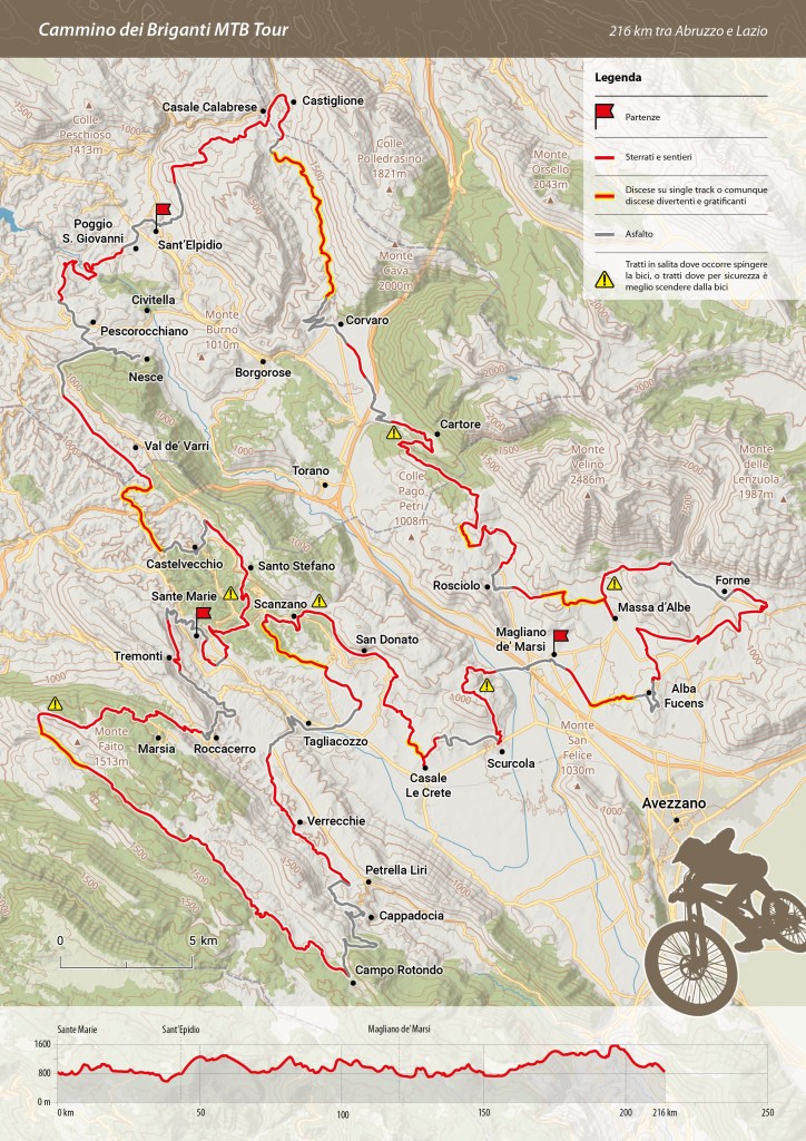 Il Cammino dei briganti raddoppia! Dal 2023 al cammino a piedi si affianca un percorso per mountain bike. Di 216 chilometri, il doppio del percorso a piedi. Quindi anche con le mountain bike si puรฒ pedalare ora per 4-5 giorni. In parte rimanendo sul cammino classico in parte esplorando territori limitrofi, come i monti Simbruini, tratti del Cicolano e la parte di Massa d’Albe sotto il Velino. Un percorso sfidante, rivolto a bikers allenati e con una discreta esperienza. Non รจ fattibile in gravel.