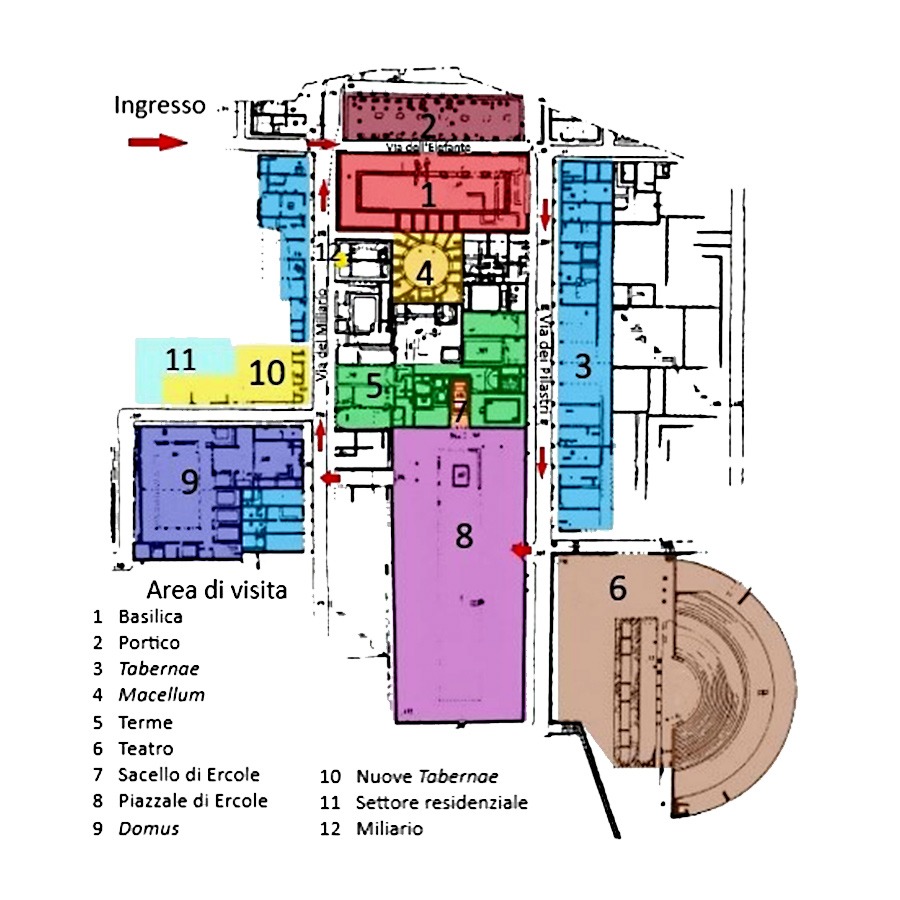 Il Santuario di Ercole si compone di un piccolo ambiente riservato al culto del Dio (7) e di un ampio piazzale antistante (8), dove, in anni recenti, sono state effettuate numerose campagne di scavo. Nel piccolo sacello era custodita la statua monumentale di Ercole seduto a banchetto, oggi conservata al Museo Archeologico Nazionale di Chieti. La presenza del dio in corrispondenza di una piazza destinata al commercio di animali garantiva serietร nelle contrattazioni. Il dio Ercole era protettore del sale e degli armenti e per questo molto venerato in una societร che attingeva il maggior sostentamento da un contesto rurale e pastorale. Attraversando il Piazzale del Santuario di Ercole (8), si arriva su Via del Miliario, dalla quali si accede, salendo dei gradini, ad un grande edificio, riconosciuto come Domus (9), ma forse utilizzato anche per altre funzioni (collegium). Il primo impianto risale al II sec. a.C., mentre oggi la vediamo nella ricostruzione del I sec. d.C. Nellโatrio รจ riconoscibile una depressione del terreno (impluvium) per la raccolta dellโacqua piovana che cadeva dallโapertura del tetto. Sul giardino porticato con colonne in mattoni si aprivano stanze da letto (cubicula) e stanze da pranzo (triclinia), pavimentate a mosaico.