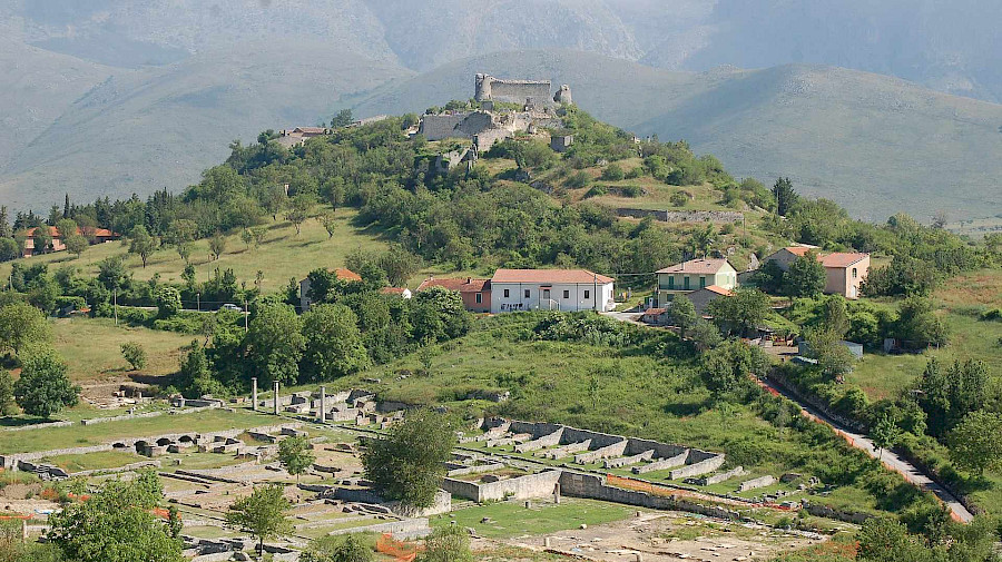 La città romana di Alba Fucens sorge in una piccola valle circondata da tre colline, in un’area occupata dagli Equi, nel territorio a nord-ovest dell’antico Lago Fucino.